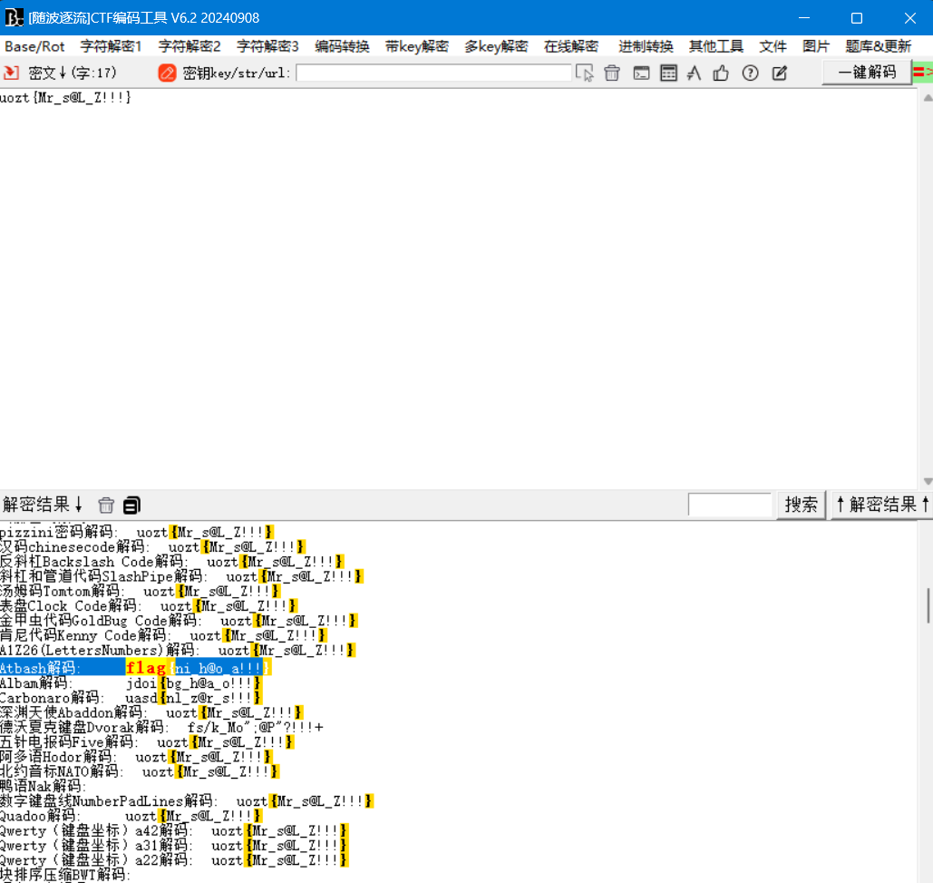 发现是Atbash编码,提交flag发现不对,注意到hint,改大小写-》flag{Ni_h@O_A!!!},over!