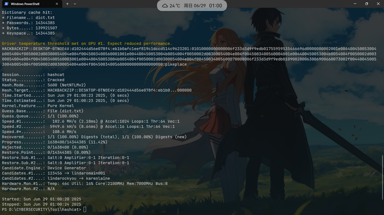 modifiedntlmv2respomse:01010000000000006f233d3d9f9edb01755959535466696d0000000002001e004400450053004b0054004f0050002d00300054004e004f0045003400560001001e004400450053004b0054004f0050002d00300054004e004f0045003400560004001e004400450053004b0054004f0050002d00300054004e004f0045003400560003001e004400450053004b0054004f0050002d00300054004e004f00450034005600070008006f233d3d9f9edb010900280063006900660073002f004400450053004b0054004f0050002d00300054004e004f004500340056000000000000000000hashcat字典爆破: