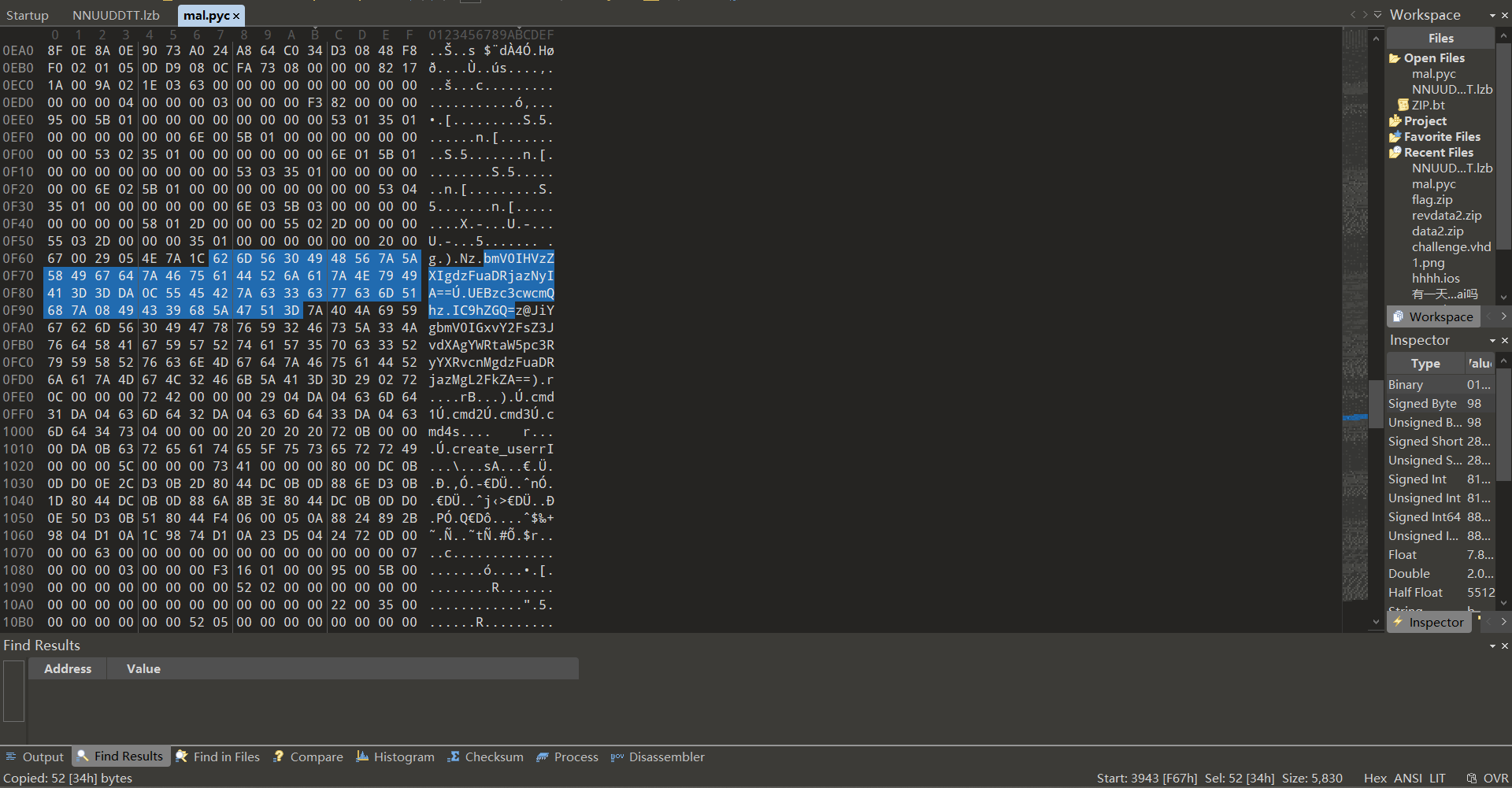 上一问的木马导出,用pyinstxtractor处理,得到mal.pyc,010打开,注意到base64编码的部分字符(前方存在create、base64)